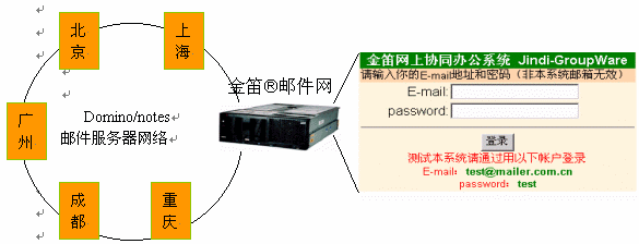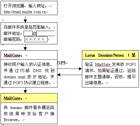 (1) 在不改變現(xiàn)有網(wǎng)絡(luò)硬件、軟件環(huán)境的情況下,添加一臺郵件網(wǎng)關(guān)服務(wù)器,通過統(tǒng)一的web登陸界面,輸入Email地址和密碼后,金笛?郵件網(wǎng)關(guān)會自動根據(jù)內(nèi)部DNS找到該用戶所在的Domino Mail Server, 并通過標(biāo)準(zhǔn)郵件協(xié)議POP3提取該用戶的郵件,以web頁面形式顯示在用戶屏幕上。