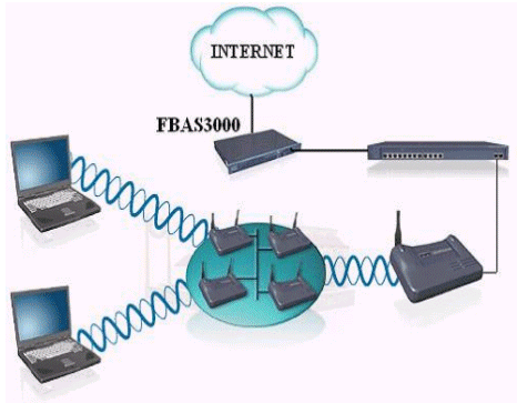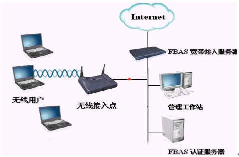 移動用戶通過自身的無線網卡傳遞信息到熱點接收器上,熱點接收器連接到交換機(是為了能具有更好的可拓展性),交換機連接到華夏科技FutureWorks寬帶計費系統(tǒng)的FBAS接入服務器上,通過接入服務器連接到INTERNET.這里的FBAS3000系列的寬帶接入服務器采用的是一體機的模式,接入,認證,計費等一系列服務均安裝在FBAS里,這樣可以簡化網絡結構。對FBAS的操作是通過WEB頁面來進行設置維護的,
