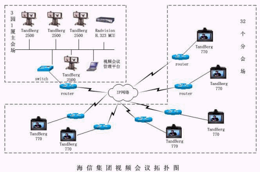 海信集團(tuán)有限公司會(huì)議電視項(xiàng)目的1.152兆共享線(xiàn)路,網(wǎng)絡(luò)設(shè)備采用了CISCO的路由、交換設(shè)備。在選型中,我們?yōu)橹鲿?huì)場(chǎng)配置了TANDBERG2500型號(hào)的產(chǎn)品,在分會(huì)場(chǎng)配置了TANDBERG880型號(hào)的產(chǎn)品。整個(gè)視頻網(wǎng)絡(luò)是分二級(jí)組建的,中心配置了RADVISION的MCU用來(lái)召開(kāi)36個(gè)點(diǎn)會(huì)議。視頻網(wǎng)絡(luò)結(jié)構(gòu)拓?fù)鋱D如下。