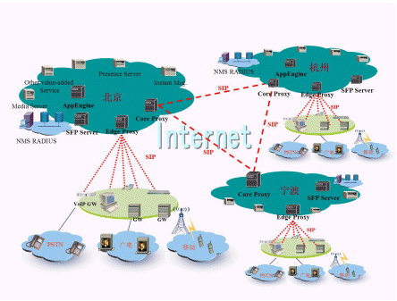 采用SIP作為統(tǒng)一的信令協(xié)議,NGN網(wǎng)絡(luò)體系結(jié)構(gòu),傳輸與控制分離,控制與業(yè)務(wù)分離。北京旋極及其合作伙伴提供整個(gè)端到端的基于SIP的電信全套解決方案。系統(tǒng)平臺(tái)由各種Proxy Servers(Firewall control Proxy,Edge Proxy,Core Proxy)組成路由網(wǎng)絡(luò);Location Server,Application Server,Presence Server,Media Server Cluster組成服務(wù)平臺(tái)的基本部分;互聯(lián)互通模塊:Core Proxy,Cisco AS5300網(wǎng)關(guān)或Softswitch。以下的簡(jiǎn)化的示意圖: