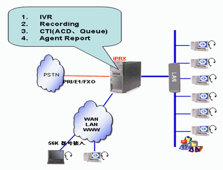 Asterisk IP PBX與相關板卡結合就能夠實現IP PBX與呼叫中心完美結合的一體化解決方案。該方案結合了IP網的靈活性及硬件平臺自身強大的通信能力、板載資源、媒體處理能力和多種接口等而產生的一種高效、便捷、低成本的應用方案。與傳統(tǒng)PBX及IP