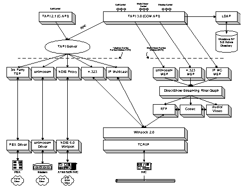最新的TAPI 3.0基于微軟的COM標(biāo)準(zhǔn),它允許TAPI應(yīng)用程序采用包括JAVA?、Visual Basic?、Visual C++?在內(nèi)的各種語言進行編寫,同時還可以方便的通過ActiveX技術(shù)將其移植到互聯(lián)網(wǎng)中去。TAPI除了支持傳統(tǒng)的電話應(yīng)用,還支持標(biāo)準(zhǔn)的H.323會議和IP多點會議,良好的QoS支持使得它增強了會議的質(zhì)量和網(wǎng)絡(luò)的可管理性。TAPI采用了統(tǒng)一的媒體流接口-DirectShowTM,TAPI媒體流提供商(MSP)只要針對不同的電話提供商(TSP)來實現(xiàn)DirectShowTM接口就可以被應(yīng)用程序使用。
