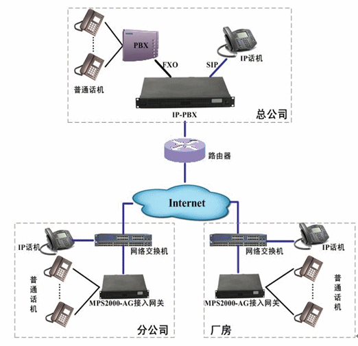 各分公司根據(jù)實(shí)際分機(jī)數(shù)配置相應(yīng)的接入網(wǎng)關(guān)或IP話機(jī)。接入網(wǎng)關(guān)和IP話機(jī)通過Internet注冊到位于總公司的IP-PBX上,實(shí)現(xiàn)了總部電話和分公司、廠房電話之間的通信、號碼直撥、來電顯示等功能。