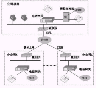 本方案采取IP語(yǔ)音接入的方法,利用88IP動(dòng)態(tài)域名解析系統(tǒng),將IPMUX電話(huà)網(wǎng)關(guān)的網(wǎng)絡(luò)接口接入到公司和分部(分公司)的局域網(wǎng)中,通過(guò)ADSL、ISDN、撥號(hào)上網(wǎng)等方式,同連接在此因特網(wǎng)上的其它IPMUX電話(huà)網(wǎng)關(guān)相連,從而將不同地域的電話(huà)連接在一起,組成整個(gè)公司的IP電話(huà)網(wǎng),以達(dá)到免費(fèi)通話(huà)的目的。