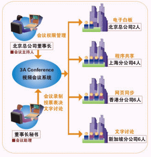 在會(huì)議中,副總經(jīng)理使用電子白板向各位主管說明了公司的整體規(guī)劃,上海分公司經(jīng)理還通過程序共享功能,將自己寫的某地市場開拓規(guī)劃書初稿共享出來,與所有與會(huì)者討論;