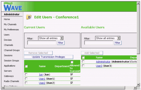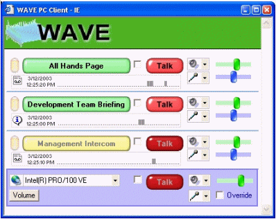 WAVE的使用方式為:管理員在服務(wù)器端建立IP電話會(huì)議,參加者使用本地計(jì)算機(jī)作為客戶端,通過耳機(jī)和麥克風(fēng)即可加入會(huì)議。一臺普通的奔四PC機(jī)可以支持?jǐn)?shù)千個(gè)會(huì)議,每個(gè)會(huì)議也允許數(shù)百個(gè)用戶參加。管理員可以分配用戶不同的權(quán)利:如講話,主持會(huì)議等等。