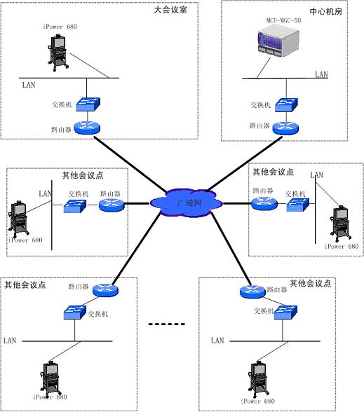 用戶將組建以多點控制單元MCU為中心,采用H.323 IP連接方式的H.323標(biāo)準(zhǔn)會議電視網(wǎng),端口速率為768kbps,多點控制單元要求的容量是可達(dá)到48個節(jié)點的同時接入。