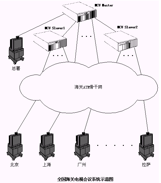 與海關(guān)ATM網(wǎng)一樣,海關(guān)電視會(huì)議系統(tǒng)也是以總署為中心的星形結(jié)構(gòu)?偸鹋渲糜腥齻(gè)相互級(jí)連的MCU,其中一個(gè)為Master,另外兩個(gè)為Slaver,分署和各海關(guān)的會(huì)議終端設(shè)備通過(guò)ATM網(wǎng)的PVC信道分別連接到Master或Slaver