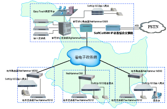×省×廳和與各地市局之間原來采用PSTN網(wǎng)絡(luò)實(shí)現(xiàn)語音通信,省局和市局,市局和市局之間每個(gè)月的通訊費(fèi)用高達(dá)數(shù)萬元,無形之中長途電話費(fèi)用已經(jīng)成為日常行政支出中很大的一部分。該廳已經(jīng)采用港灣公司NetHammer