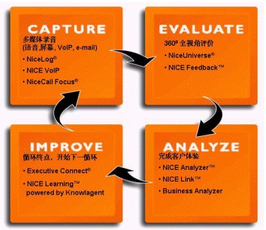 NICE System公司率先提出了CEM-客戶體驗(yàn)管理-的新觀念,是客戶體驗(yàn)管理的先驅(qū)者,它將此觀念融入在NICE錄音網(wǎng)控系統(tǒng)中,與ACD、CTI及CRM等客服中心既有的投資設(shè)備整合為一體,便可達(dá)到隨時(shí)掌握客戶與客服中心間的互動(dòng)經(jīng)驗(yàn),以期能夠隨時(shí)調(diào)整客服中心的經(jīng)營方向與策略,提升客戶的滿意度,并改善坐席人員的服務(wù)效率與品質(zhì)等。 在NICE CEM的概念中,主要是以四個(gè)作業(yè)循環(huán)達(dá)成改善的目標(biāo),包括記錄(Capture)、評估(Evaluate)、分析(Analyze)、改善(Improve)等。