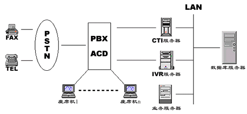 在大型CALL CENTER系統(tǒng)的設計中,這是以往最常用的方案。交換機由于其電信級標準的設計,接入容量大、交換處理能力強、性能穩(wěn)定,因而往往被大、中型呼叫中心用在前端構成ACD系統(tǒng)(自動呼叫分配系統(tǒng))用來處理排隊、路由管理、坐席管理等功能。但是由于傳統(tǒng)交換機在語音資源、傳真資源等呼叫中心基本信息資源處理能力方面的匱乏,必須通過語音板卡和PC機的方式解決,有時因為系統(tǒng)容量大,甚至需要多臺共同服務,因此,其IVR(交互式語音應答)和CTI服務器卻只能達到PC機標準,影響整體性能穩(wěn)定性。另外,由于交換機和IVR、CTI等之間的相互連接會受其密合程度和其他如電磁干擾、鼠啃蟻咬等外來因素影響,同樣會造成一些不可預知的系統(tǒng)故障。同時,PBX+CTI服務器的建設成本也非常高。