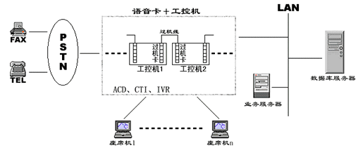 在一些小型CALL CENTER系統(tǒng)中,人們通常通過語音板卡加工控機的方式搭建系統(tǒng),通常一臺設備就集成了ACD、IVR、CTI等各種資源,各資源的使用、調派通過軟件進行控制,有效的解決了建設成本高、系統(tǒng)構造繁復的問題,具有相當的靈活性。然而由于工控機和語音板卡容量有限,同時其標準最多只能是工業(yè)級標準,因此在構建相對大型的呼叫中心時就總是捉襟見肘。為了增加系統(tǒng)容量,解決多臺PC之間進行通道交換的難題,人們又設計了過機卡和過機線來解決,其應用系統(tǒng)如下圖: