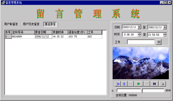 當(dāng)系統(tǒng)中無(wú)話務(wù)員登錄或等待超過(guò)20秒,則進(jìn)入語(yǔ)音信箱服務(wù)。語(yǔ)音信箱在進(jìn)入時(shí)提示用戶:“系統(tǒng)正忙,請(qǐng)留下您的聯(lián)系電話,復(fù)本機(jī)號(hào)請(qǐng)掛機(jī),復(fù)其他號(hào)碼請(qǐng)輸入電話號(hào)碼,按‘#’號(hào)鍵結(jié)束,或者在聽(tīng)到‘嘟’的一聲之后留下你的留言”,當(dāng)主叫號(hào)碼位數(shù)不夠7位時(shí),提示:“系統(tǒng)正忙,請(qǐng)輸入您的聯(lián)系電話,按‘#’號(hào)鍵結(jié)束,或者在聽(tīng)到‘嘟’的一聲之后留下你的留言”,系統(tǒng)將客戶留下的電話號(hào)碼記錄到數(shù)據(jù)庫(kù)中。將留言存放到一個(gè)指定目錄中,用話務(wù)號(hào)作為語(yǔ)音文件名。