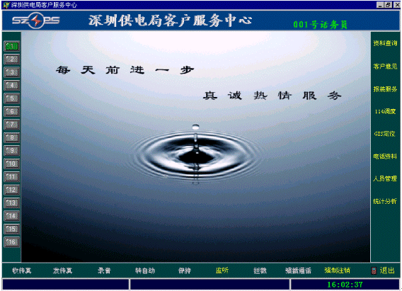 在座席的主畫(huà)面的右邊是業(yè)務(wù)功能選擇區(qū),是根據(jù)用戶實(shí)際工作的具體要求開(kāi)發(fā)的。(隨后詳細(xì)介紹供電行業(yè)的業(yè)務(wù)功能模塊)