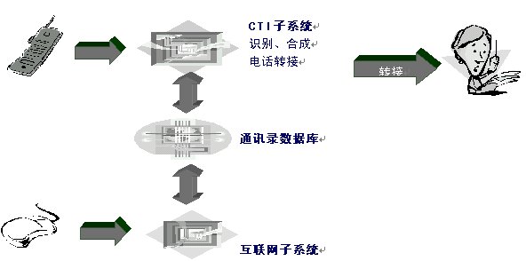 Internet子模塊相對比較簡單,可以采用目前主流的網(wǎng)絡(luò)通訊錄服務(wù)方式進行服務(wù);而為了更好服務(wù)用戶,CTI子模塊需要采用先進的語音合成和語音識別技術(shù)。
