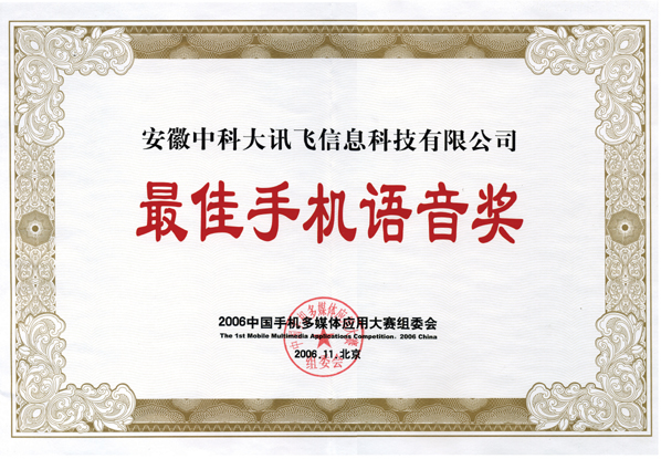 近日,首屆中國手機多媒體應(yīng)用大賽組委會將“2006最佳手機語音獎”這份沉甸甸的獎牌和證書授予了科大訊飛。這一由數(shù)十位業(yè)界專家和百萬手機用戶慎重評選出的獎項,充分說明了科大訊飛在手機語音應(yīng)用領(lǐng)域的領(lǐng)先地位,其分量不言而喻。