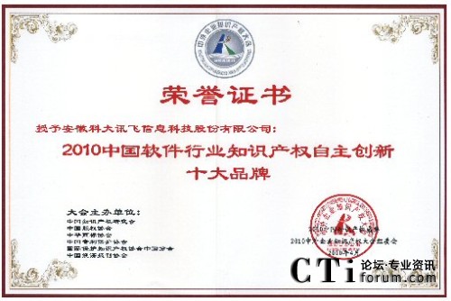 CTI論壇(ctiforum)4月29日消息(記者 潘婷婷):2010年4月25日,由中國知識(shí)產(chǎn)權(quán)研究會(huì)、中國專利保護(hù)協(xié)會(huì)、中國版權(quán)協(xié)會(huì)等單位聯(lián)合舉辦的“2010中外企業(yè)知識(shí)產(chǎn)權(quán)大會(huì)”在人民大會(huì)堂隆重舉行。在當(dāng)日的“2010中國知識(shí)產(chǎn)權(quán)盛典頒獎(jiǎng)典禮”中,科大訊飛憑借強(qiáng)大的自主創(chuàng)新能力以及在知識(shí)產(chǎn)權(quán)創(chuàng)造、保護(hù)與應(yīng)用方面的突出表現(xiàn)獲評“2010年中國軟件行業(yè)知識(shí)產(chǎn)權(quán)自主創(chuàng)新十大品牌”。