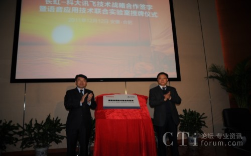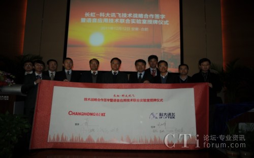 CTI論壇(ctiforum)12月14消息(記者 潘婷婷): 12月12日,科大訊飛與長虹集團(tuán)戰(zhàn)略合作簽約暨共建聯(lián)合實驗室揭牌儀式在科大訊飛語音產(chǎn)業(yè)基地研發(fā)大樓隆重舉行。根據(jù)合作框架協(xié)議,雙方將在戰(zhàn)略聯(lián)盟的基礎(chǔ)上,以共建聯(lián)合實驗室為主要載體,旨在依托各自行業(yè)領(lǐng)域的長期積淀優(yōu)勢、強強聯(lián)合,達(dá)成戰(zhàn)略互信,加強緊密合作,積極推動“語音核心引擎+智能終端平臺” 的特色應(yīng)用模式,深入拓展智能語音科技在智能電視等終端產(chǎn)品市場的應(yīng)用范圍,合力開創(chuàng)智能語音終端創(chuàng)新應(yīng)用市場空間。