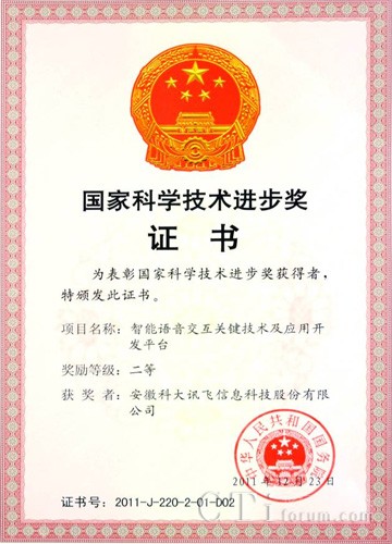 CTI論壇(ctiforum)2月20日消息(記者 浩宇):2月14日,2011年度國家科學(xué)技術(shù)獎(jiǎng)勵(lì)大會(huì)在北京隆重舉行,黨和國家領(lǐng)導(dǎo)人胡錦濤、溫家寶、李長春、李克強(qiáng)出席大會(huì)并為獲獎(jiǎng)代表頒獎(jiǎng)。由科大訊飛和中國科學(xué)技術(shù)大學(xué)聯(lián)合提交的“智能語音交互關(guān)鍵技術(shù)及應(yīng)用開發(fā)平臺(tái)”項(xiàng)目榮獲國家科技進(jìn)步二等獎(jiǎng),在本年度信息化領(lǐng)域(計(jì)算機(jī)與自動(dòng)控制、通信、現(xiàn)代服務(wù)業(yè)信息化等專業(yè)組)一等獎(jiǎng)空缺的情況下,該項(xiàng)目在計(jì)算機(jī)與自動(dòng)控制專業(yè)組所有項(xiàng)目中排名第一。這是科大訊飛第二次獲得這一國家獎(jiǎng)重大榮譽(yù),也是語音產(chǎn)業(yè)界唯一獲此殊榮的企業(yè)。
