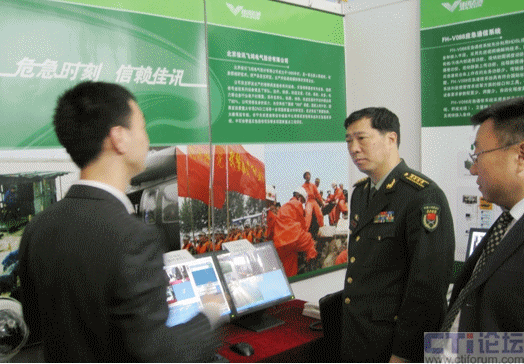 圖為:解放軍總參謀部應(yīng)急辦公室主任田義祥大校參觀佳訊展臺