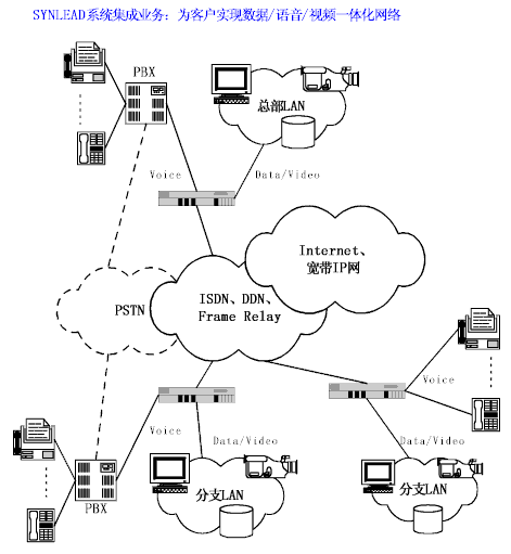在這里,數(shù)據(jù)/話音/視頻一體化網(wǎng)絡(luò)主要是指多分支機構(gòu)集團化企業(yè),通過ISDN、DDN、Frame Relay、Internet、寬帶IP等廣域網(wǎng)互聯(lián)手段,實現(xiàn)Data/Voice/Video"總線復用"的增值技術(shù)。