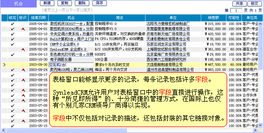上圖"機會管理"表格窗口進一步對人本化的管理方法進行了舉例。在這里,您可直接對瀏覽到的字段進行交互(是否能夠新建、修改、刪除,受管理授權(quán)或默認(rèn)授權(quán)約束),而不必一定要轉(zhuǎn)到另外的窗口才可操作字段。該方法在SynleadCRM中處處存在,它不僅僅為了提高工作效率,更讓企業(yè)在推行CRM管理變革時襯托出靈活性,而不是帶來了僵化。