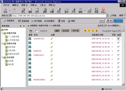 3、 Internet檢索:用戶(hù)用Web瀏覽器通過(guò)Internet實(shí)現(xiàn)播放、刪除、傳送、轉(zhuǎn)發(fā)、存取各自的語(yǔ)音郵件消息。