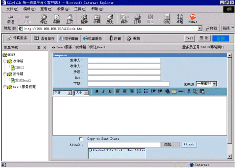 AllyTalk統(tǒng)一消息的電子郵箱具有與Microsoft Exchange或OutLook相同的功能,可以通過(guò)設(shè)定Email服務(wù)的參數(shù),實(shí)現(xiàn)公司內(nèi)部收發(fā)Email,或通過(guò)Email服務(wù)器實(shí)現(xiàn)與Internet的通信;