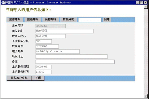 4、來(lái)電顯示:當(dāng)有外線(xiàn)電話(huà)撥入坐席,坐席電話(huà)振鈴的同時(shí),會(huì)在顯示器上彈出新窗口顯示來(lái)電用戶(hù)的信息;