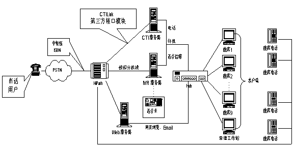企業(yè)級(jí)統(tǒng)一消息平臺(tái),它將交換技術(shù)、CTI技術(shù)、INTERNET技術(shù)合理地應(yīng)用到系統(tǒng)中,包含了基于數(shù)據(jù)庫(kù)的智能化呼叫分配(ACD)、交互式語(yǔ)音應(yīng)答(IVR)、傳真服務(wù)器(Fax