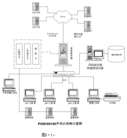 系統(tǒng)主要由計算機網(wǎng)絡(luò)、數(shù)字中繼接口、人工座席、語音處理及存儲、系統(tǒng)管理(數(shù)據(jù)庫管理+計費管理+語音編輯)幾部分組成。如圖2·1所示: