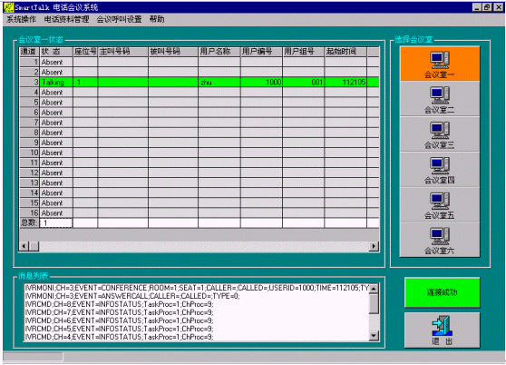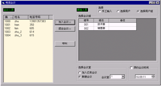 管理員只需將候選人員加入到左邊的會議人員中,再點(diǎn)擊"呼叫"按扭即可建立會議,系統(tǒng)自動呼叫會議各方的電話號碼,呼通后將自動加入設(shè)置的會議室,呼叫失敗自動重新呼叫;