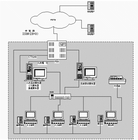 系統(tǒng)目前共設(shè)置了多個人工座席,每人工座席有電腦一臺,耳機式電話一部。人工座席的電腦與CTI,IVR語音服務器及數(shù)據(jù)庫服務器共處一個局域網(wǎng)內(nèi)。