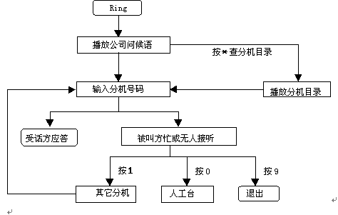 這種情況下自動總機服務扮演了如同人工總機的角色,提示來話方鍵入分機號碼并將其轉(zhuǎn)接到指定的分機去。如果轉(zhuǎn)接不成功(被叫方占線,無人接聽等)系統(tǒng)提示主叫轉(zhuǎn)到其它分機或轉(zhuǎn)人工臺。