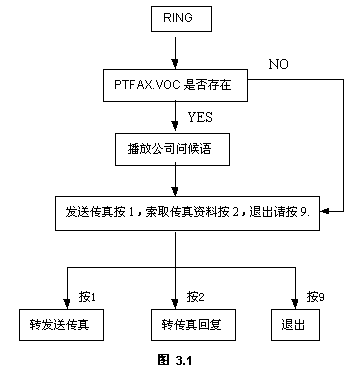 其中PTFAX.VOC存在當(dāng)前工作路徑,如果存在,則播放公司問(wèn)候語(yǔ),接著播放下一句語(yǔ)音提示;如果該文件不存在,則系統(tǒng)直接播放VFGT.VOC的內(nèi)容,用戶(hù)可根據(jù)實(shí)際需求而定。