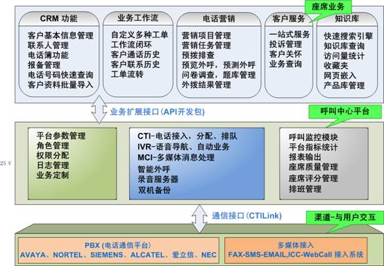 呼叫中心通信平臺,包含了交換機(PBX)、CTI服務器、IVR服務器、傳真服務器、全程錄音設備等幾個部分,是客服中心實施的基礎。