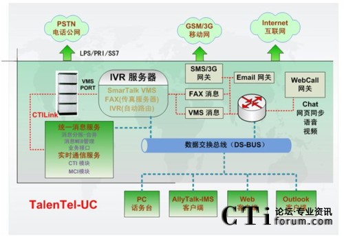 “TalenTel-UC企業(yè)級(jí)統(tǒng)一通信系統(tǒng)”采用CTI的核心技術(shù),把企業(yè)通信系統(tǒng)、計(jì)算機(jī)辦公系統(tǒng)、和業(yè)務(wù)流程有機(jī)結(jié)合起來,充分利用企業(yè)現(xiàn)有設(shè)備資源,實(shí)現(xiàn)IT系統(tǒng)的易用性和通信系統(tǒng)的實(shí)用性,從而推動(dòng)企業(yè)信息化、無紙化辦公進(jìn)程,降低辦公成本,提高辦公效率,對(duì)行政辦公模式的變革產(chǎn)生深遠(yuǎn)的影響。