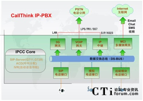 IPCC Core是IP-PBX的核心部分,提供了配置IP分機號碼(Extension Number)、功能按鈕以及通話管理和ACD路由策略功能;它可以支持多達1000個IP語音終端呼叫請求,通過分組交換,實現(xiàn)IP分機、普通分機、互聯(lián)網(wǎng)上IP電話之間的互聯(lián)互通;通過Voip網(wǎng)關(guān),可以實現(xiàn)IP網(wǎng)絡(luò)和傳統(tǒng)電路交換電話網(wǎng)的通信,完成異種網(wǎng)絡(luò)的電話呼入和呼出;