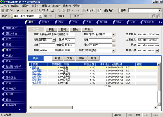 客戶單位的分類(lèi)較聯(lián)系人的分類(lèi)更復(fù)雜。常用的分類(lèi)有:按照企業(yè)規(guī)模來(lái)分類(lèi)(大、中、小,層次自定義,下同)、按照該客戶與本單位的緊密程度分類(lèi)(緊密、普通、疏遠(yuǎn))、按照該客戶的重要性分類(lèi)(重要、普通、次要)、按照該客戶的忠誠(chéng)度分類(lèi)(忠誠(chéng)、普通、游移)。有一些用戶企業(yè),希望對(duì)客戶單位特征進(jìn)行采集,進(jìn)而進(jìn)行客戶信用評(píng)價(jià)。信用特征的類(lèi)別可以多達(dá)數(shù)十種類(lèi)(詳細(xì)情況可參考有關(guān)書(shū)籍)。利用SynleadCRM,您可以為每個(gè)類(lèi)指定系數(shù),為類(lèi)下屬的每個(gè)評(píng)價(jià)指定評(píng)分分值。例如,您可以建立一個(gè)類(lèi)別為"客戶倉(cāng)庫(kù)積壓商品的情況",系數(shù)為1,該類(lèi)別下屬的評(píng)價(jià)有"很多1分"、"一般3分"、"少1分"、"未知0分",如果指定某客戶該類(lèi)別的評(píng)價(jià)為一般,則該項(xiàng)目得分為3分*1(系數(shù))=3分。依此類(lèi)推,您還可以指定更多的分類(lèi)與評(píng)價(jià),例如:客戶經(jīng)營(yíng)場(chǎng)所所處的位置、客戶在企業(yè)生命周期中所處的位置、客戶在行業(yè)中的地位、客戶產(chǎn)品的組合情況、客戶產(chǎn)品覆蓋的市場(chǎng)范圍、客戶產(chǎn)品的淡旺季規(guī)律、客戶近年?duì)I業(yè)額的增減趨勢(shì)、客戶的年度營(yíng)業(yè)額、客戶的現(xiàn)金周轉(zhuǎn)能力、客戶的負(fù)債情況、客戶是否涉及中大訴訟等。每一個(gè)類(lèi)別項(xiàng)目的評(píng)分經(jīng)過(guò)系數(shù)的加權(quán)運(yùn)算后,可以求和,得到這個(gè)客戶的總評(píng)分。未來(lái)也可以利用分析模型對(duì)此類(lèi)數(shù)據(jù)進(jìn)行進(jìn)一步的分析,提供輔助決策所需要的圖表和報(bào)表。