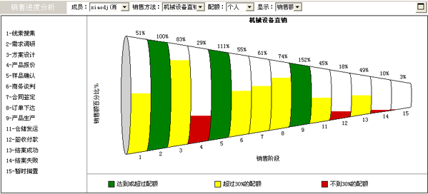 圓錐體上方每個階段都對應(yīng)一個百分比數(shù)值,表示當(dāng)前各個銷售階段的銷售額與該階段任務(wù)指標(biāo)的比率。例如假設(shè)"線索搜集"階段的任務(wù)指標(biāo)是100,000元,當(dāng)前的比率是51%,則表示當(dāng)前處于"線索收集"階段的機(jī)會的銷售額之和是51,000元。如果銷售額/任務(wù)指標(biāo)的值小于30%,則以紅色塊表示;如果值介于30%~100%則以黃色塊表示,如果值大于或等于100%,則以綠色塊表示。