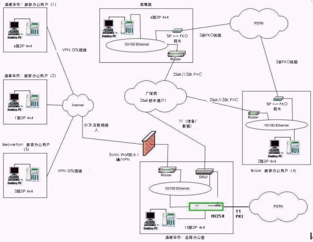 系統(tǒng)的安裝是由蘇迪思科技公司的認證增值分銷商Xiologix 來實現的。在45分鐘內Xiologix 的工程師就設定和調試完畢MX250并且完成了第一期20部蘇迪思ZIP4x4 IP電話的安裝。一個月后Consani Associates公司又進行了系統(tǒng)擴展追加了30個用戶許可和另外30部ZIP4x4 IP電話。Consani Associates 公司采用蘇迪思科技的MX250系統(tǒng)后的公司系統(tǒng)網絡拓樸圖如下: