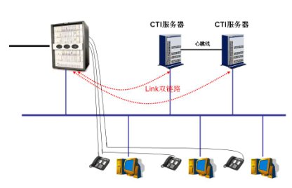 采用Hi-Link鏈路級(jí)雙機(jī)備份機(jī)制可有效地防止呼叫中心系統(tǒng)單點(diǎn)故障的發(fā)生。呼叫中心兩臺(tái)互為熱備的CTI系統(tǒng)通過獨(dú)立的CTI Link鏈路連接到交換機(jī),使得該雙機(jī)熱備方案真正成為無單點(diǎn)故障的熱備方案。系統(tǒng)框圖如下: