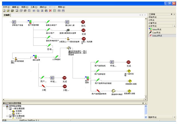 Hi-Link提供圖形化、流程式的ACD路由策略定制工具,實(shí)現(xiàn)ACD流程的靈活定義和配置。該工具不僅僅實(shí)現(xiàn)了流程邏輯、資源管理和數(shù)據(jù)庫訪問的可配置,而且可以在流程中內(nèi)嵌VBScript處理邏輯,進(jìn)而實(shí)現(xiàn)更加強(qiáng)大的路由管理能力。如圖所示: