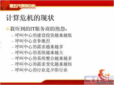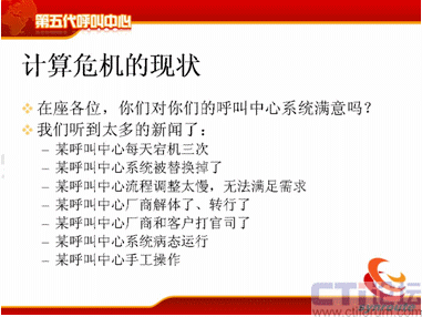 呼叫中心現(xiàn)在已經(jīng)了比較嚴(yán)重的計(jì)算危機(jī),我聽到了很多,因?yàn)槲抑攸c(diǎn)是在搞技術(shù)這一行當(dāng),我就問(wèn)一個(gè)問(wèn)題,在座的各位,你們對(duì)你們的呼叫系統(tǒng)滿意嗎?我相信大部分人可能嘴上都說(shuō)比較滿意,但是很多人對(duì)深層次的矛盾都非常清楚,為什么不滿意?
