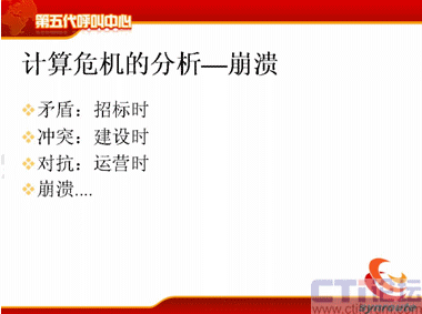 這個(gè)時(shí)候運(yùn)營(yíng)管理者的不滿就很多了,剛才已經(jīng)提到了,那么現(xiàn)在的計(jì)算危機(jī)就導(dǎo)致了一種崩潰,招標(biāo)的時(shí)候產(chǎn)生矛盾,建設(shè)的時(shí)候就有沖突,運(yùn)營(yíng)的時(shí)候就有對(duì)抗,最后系統(tǒng)崩潰。在座的運(yùn)營(yíng)管理者都得想一想,經(jīng)營(yíng)者也得想一想,但是從我們這個(gè)角度來(lái)說(shuō),我們做IT服務(wù)的,應(yīng)該從更深層次的角度上去考慮問(wèn)題。