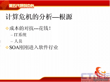 我們分析這個(gè)根源,根源其實(shí)就是錢的問(wèn)題,昨天我聽了遠(yuǎn)傳的Bill的講座,講得非常精彩,而且非常幽默,他在整個(gè)講的過(guò)程中,不斷地提一個(gè)次,提了30多次,說(shuō)是“很花錢”呀,“太花錢”了,“很花錢”。確實(shí)是很花錢,呼叫中心是一個(gè)燒錢的中心,這是他的理論,其實(shí)我的想法也是一樣的。那么對(duì)于IT系統(tǒng)來(lái)說(shuō),確實(shí)需要花很多錢,現(xiàn)在的系統(tǒng)大家想想系統(tǒng)要么和CRM對(duì)接,要么和ERP對(duì)接,有的和供應(yīng)鏈對(duì)接,有的和人力資源管理對(duì)接,有的和業(yè)務(wù)核心系統(tǒng)對(duì)接。那么人員上也是很花錢的,對(duì)于外包呼叫中心來(lái)說(shuō),客戶服務(wù)200座席左右的,人工的成本占到了75%,這個(gè)成本是非常高的,確實(shí)是很花錢。那么剛才也說(shuō)了,剛才那些需求,短信的需求,大家看雖然很復(fù)雜,如果給我一千萬(wàn)的話,我能輕松地把它搞定,給我一年的時(shí)間,但這是不現(xiàn)實(shí)的。解決的辦法有嗎?有,SOA。SOA是現(xiàn)在軟件行業(yè)一直在做的一件事情,是公認(rèn)的標(biāo)準(zhǔn),但是它剛剛進(jìn)入中國(guó),而且還都沒(méi)有進(jìn)入呼叫中心。
