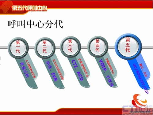 從分代上來(lái)講,和何總說(shuō)的稍微有點(diǎn)差異,但是基本上一樣的,第一代是人工熱線的電話系統(tǒng),時(shí)間點(diǎn)也差不多;第二代是有了座席IVR、自動(dòng)語(yǔ)音應(yīng)答這個(gè)特點(diǎn);第三代是有了CTI、ACD企業(yè)級(jí)的呼叫中心;第四代是互聯(lián)網(wǎng),有VOIP、多媒體等等這些多媒體的呼叫中心。那么第五代是什么?第五代的典型特征是融合共享,它是有四個(gè)特性,UC、SOA、JIT和TSP,這是五代的幾個(gè)主要特點(diǎn)。