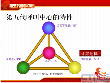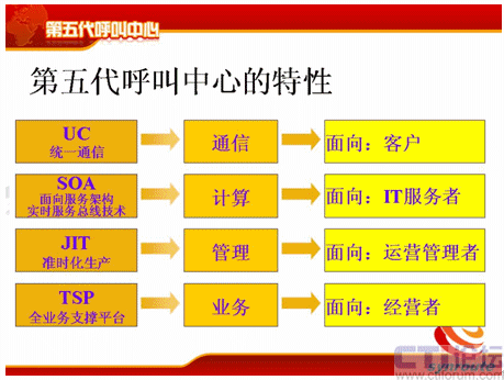 第五代呼叫中心的定義比較簡(jiǎn)單,第五代呼叫中心是基于UC的,基于SOA和實(shí)時(shí)服務(wù)總線技術(shù)的,具備JIT管理思想和作為全業(yè)務(wù)支撐平臺(tái)TSP的呼叫中心系統(tǒng)。