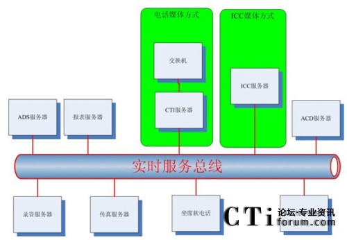 從上圖可以看出,通過實時服務(wù)總線,電話媒體方式和ICC媒體方式與其他服務(wù)的調(diào)用關(guān)系保持一致即可: