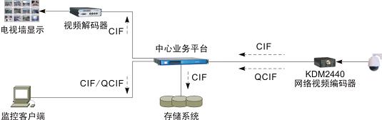 KDM2440/2440P支持雙碼流功能,輸入的單路模擬視頻經(jīng)雙路編碼后,變成CIF、QCIF兩路不同分辨率的視頻碼流同時上傳至中心業(yè)務平臺,以滿足差異化的視頻錄像存儲與客戶端瀏覽應用需求。